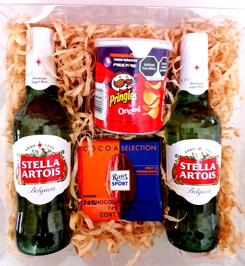 Un elegante regalo conformado por una rica selección de dulces detalles como pasitas con chocolate, aritos de gomita y Ferrero Rocher acompañdos de una botella de Vino Afrutado 4 Soles